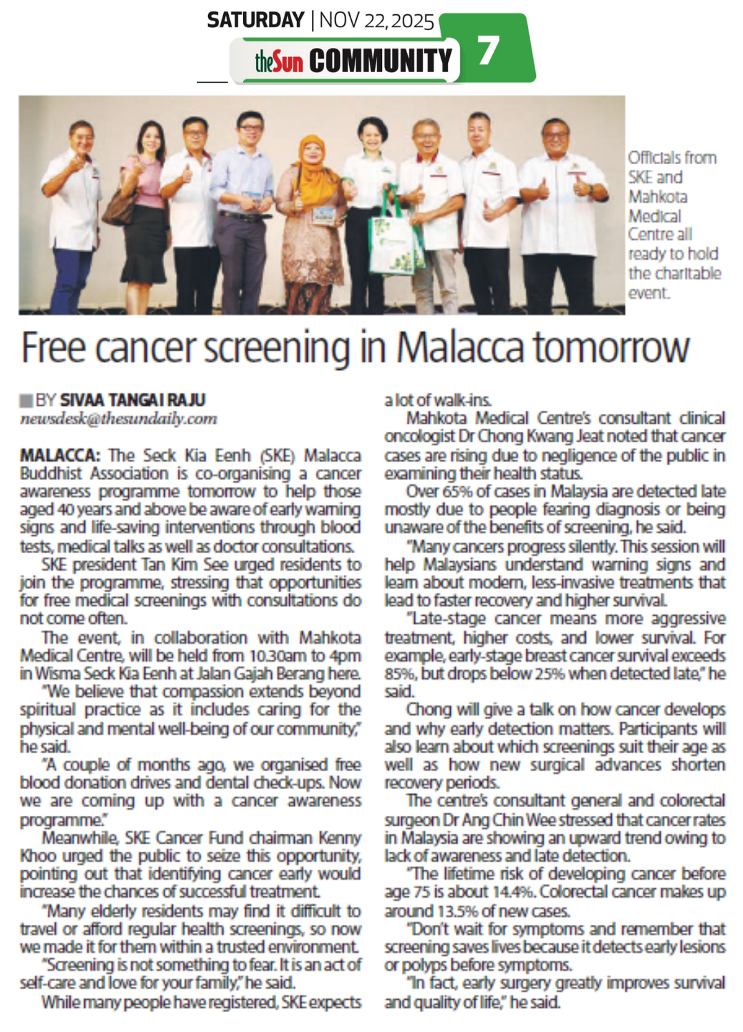 Meanwhile, SKE Cancer Fund chairman Kenny Khoo urged the public to seize this opportunity, pointing out that identifying cancer early would increase the chances of successful treatment.