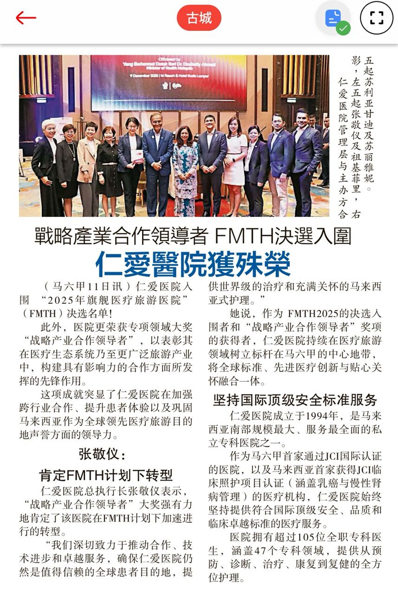 “‘战略产业合作领导者’大奖强有力地肯定了我们在 FMTH 计划下加速进行的转型。我们深切致力于推动合作、技术进步和卓越服务,确保仁爱医院仍然是值得信赖的全球患者目的地,提供世界级的治疗和充满关怀的马来西亚式护理。”